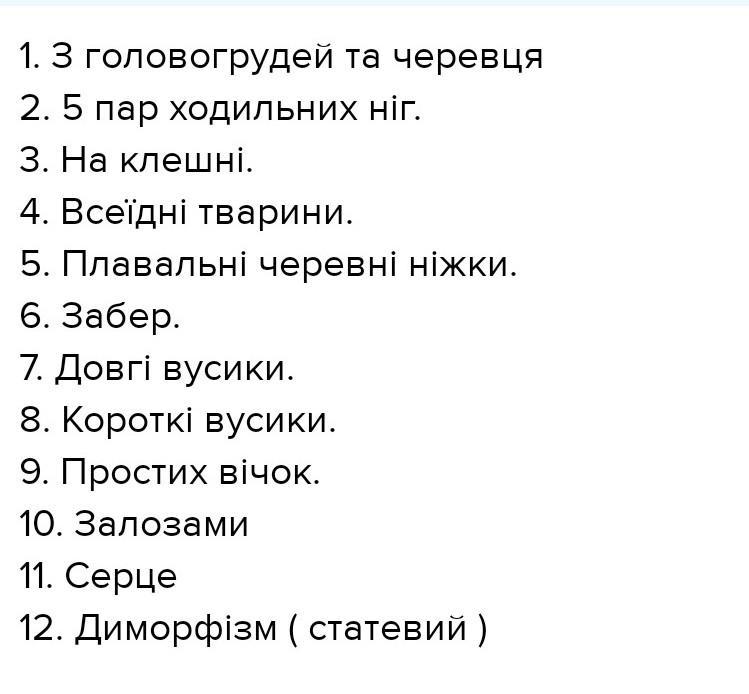 1. Тело рака состоит из 2. К головогрудям присоединяются 5…3. Первая пара конечностей превратилась в ... 4. По типу питания ...... 5. Ha брюшке располагаются .... 6. Раки дышат с помощью... 7. Органы соприкосновения у раков... 8. Органы обоняния у раков... 9. Сложные глаза раков состоят из... 10. Органы выделения представлены... 11. Главный орган в кровеносной ... 12. Для раков свойственен ***