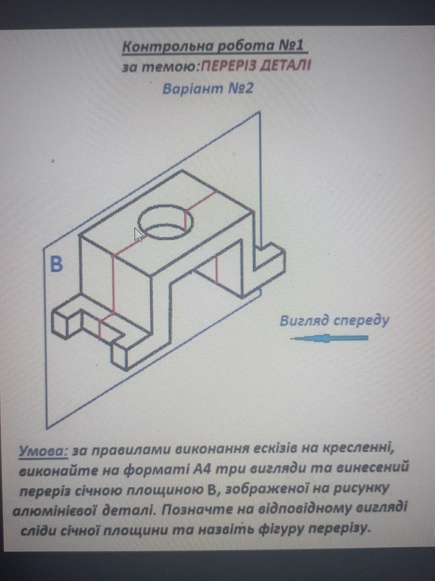 Умова: за правилами виконання ескізів на кресленні, виконайте на формамі А4 три вигляди та винесений переріз сiчною площиною в, зображеної на рисунку алюмінієвої деталі. Позначте на відповідному вигляді сліди сiчноï площини та назвiть фігуру перерізу.