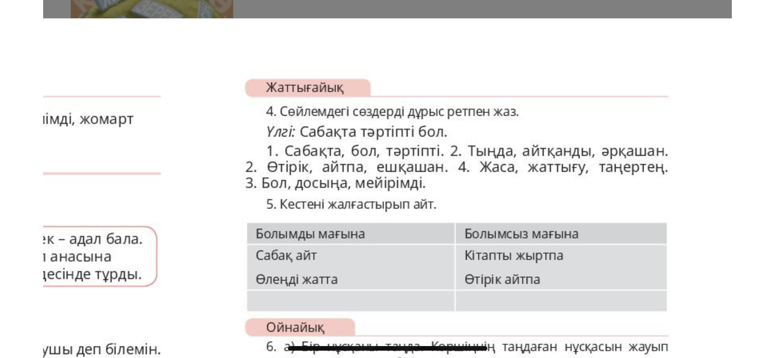 Әрқашан айтқанды тыңда. Ешқашан өтірік айтпа. Таңертен жаттығу жаса. Досыңа мейірімді бол