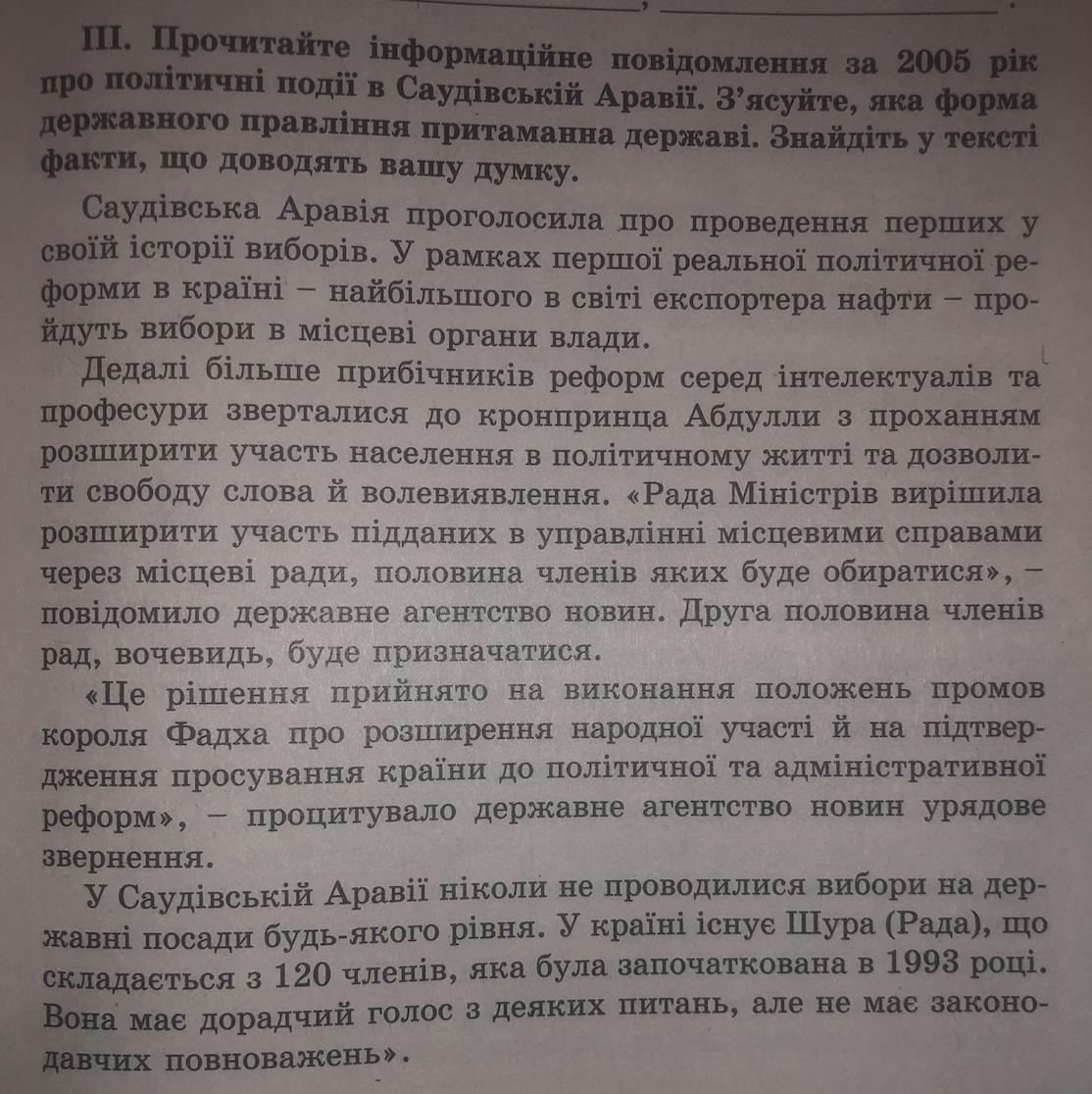 Прочитайте інформаційне повідомлення за 2005 рік про політичні події в Саудівській Аравії. З‘ясуйте, яка форма державного правління притамана державі. Знайдіть у тексті факти, що доводять вашу думку.