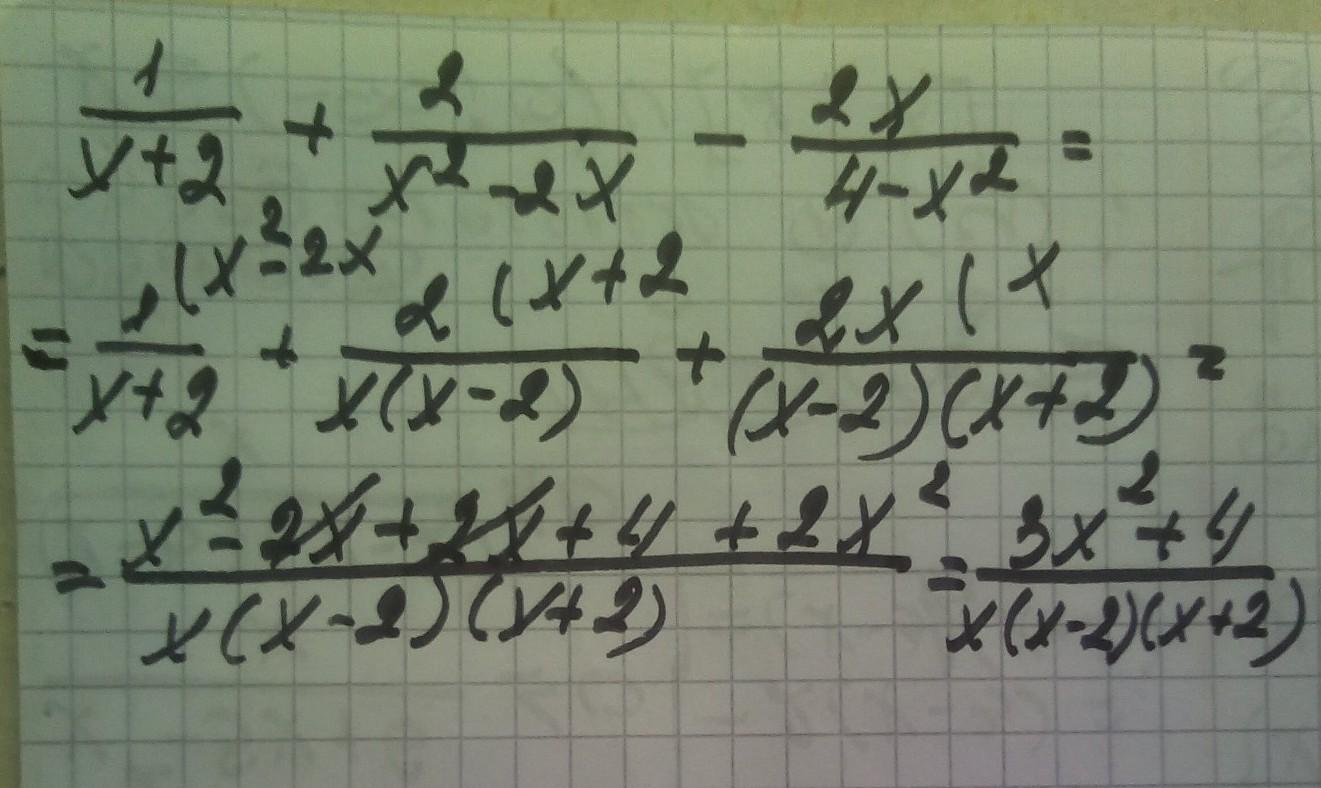 \frac{1}{x + 2} + \frac{2}{ {x}^{2} - 2x} - \frac{2x}{4 - {x}^{2} }