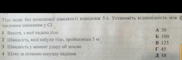 Тіло падає без початкової швидкості впродовж 5с. Установіть відповідність між числовими значенням.