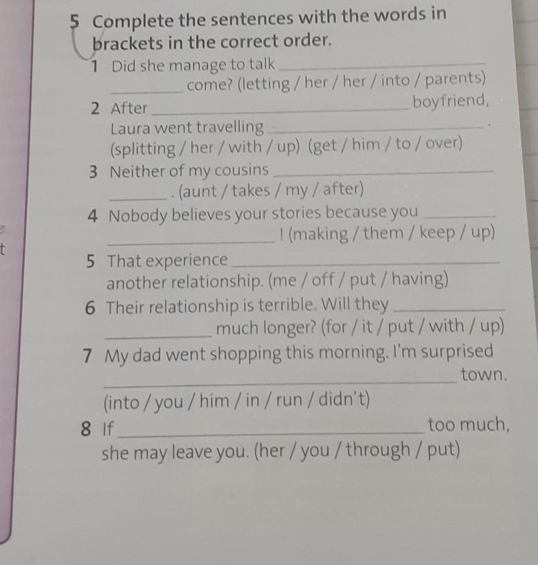 5 Complete the sentences with the words in brackets in the correct order. 1 Did she manage to talk 2 After come? (letting/her/her/into / parents) boyfriend, Laura went travelling (splitting/her/with/up) (get/ him/to/over) 3 Neither of my cousins (aunt/takes/my/ after) 4 Nobody believes your stories because you ! (making/them/ keep / up) 5 That experience another relationship. (me/off /put/having) 6 Their relationship is terrible. Will they much longer? (for/it/put/with/up) 7 My dad went shopping this morning. I'm surprised town. (into /you/him/ in / run / didn't) 8 If she may leave you. (her/you/through / put) too much,