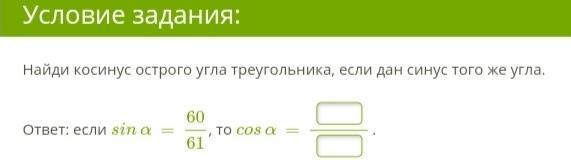 Найди косинус острого угла треугольника, если дан синус того же угла.