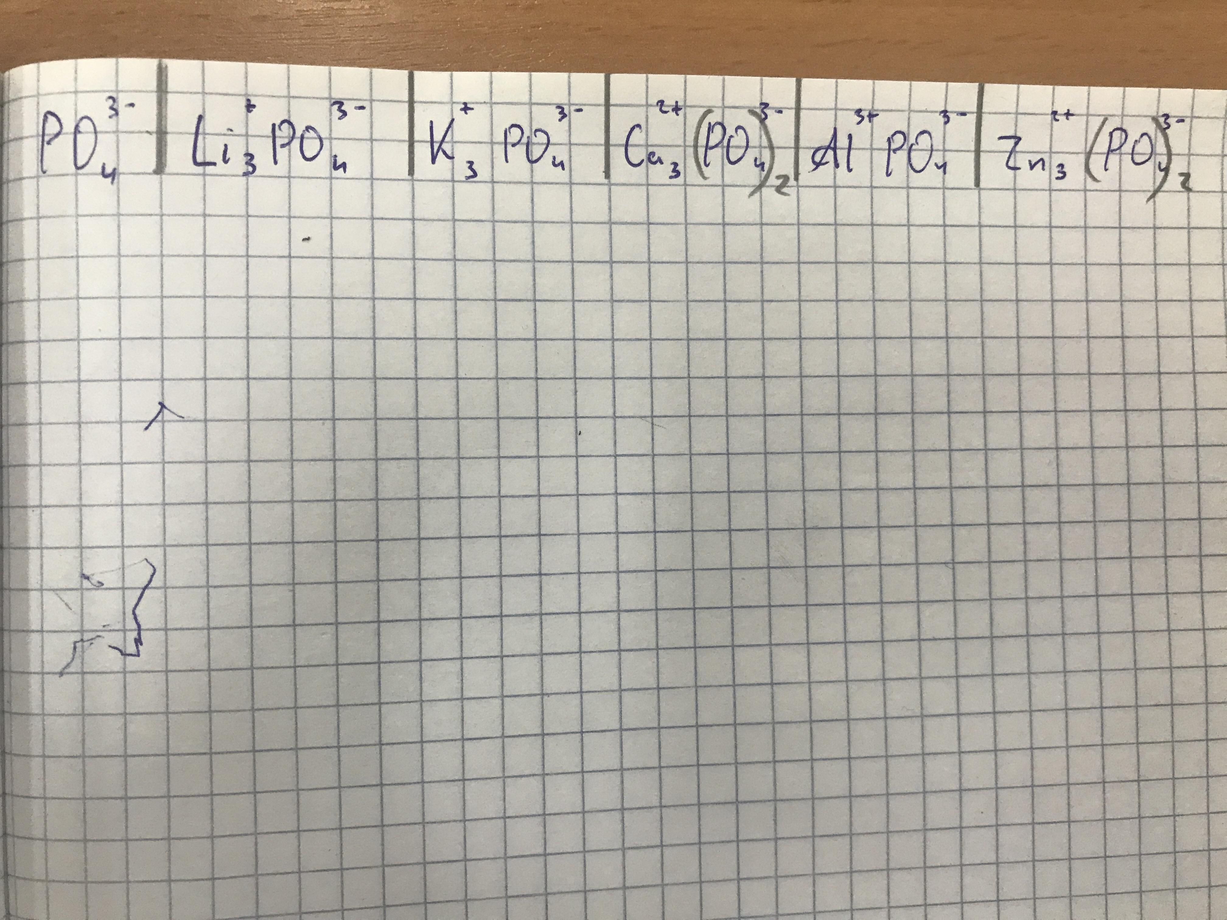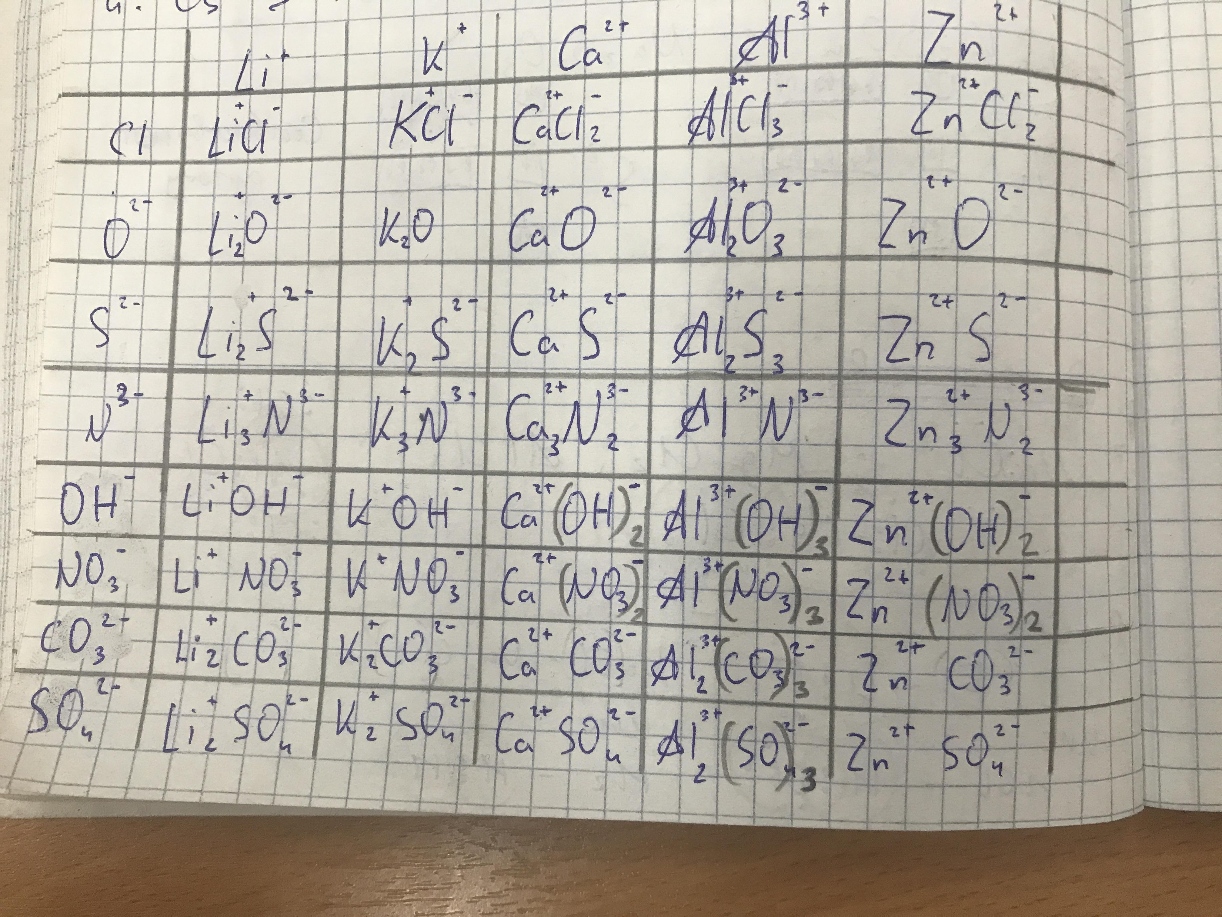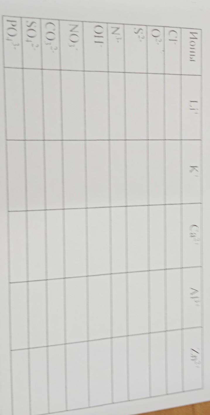 заполните таблицу ионы CI-, O²-,S²-,N³-,OH-,NO3-,CO3²-,SO4²-,PO4³-, LI⁴ K¹ Ca²⁴,AI³⁴, Zn²⁴
