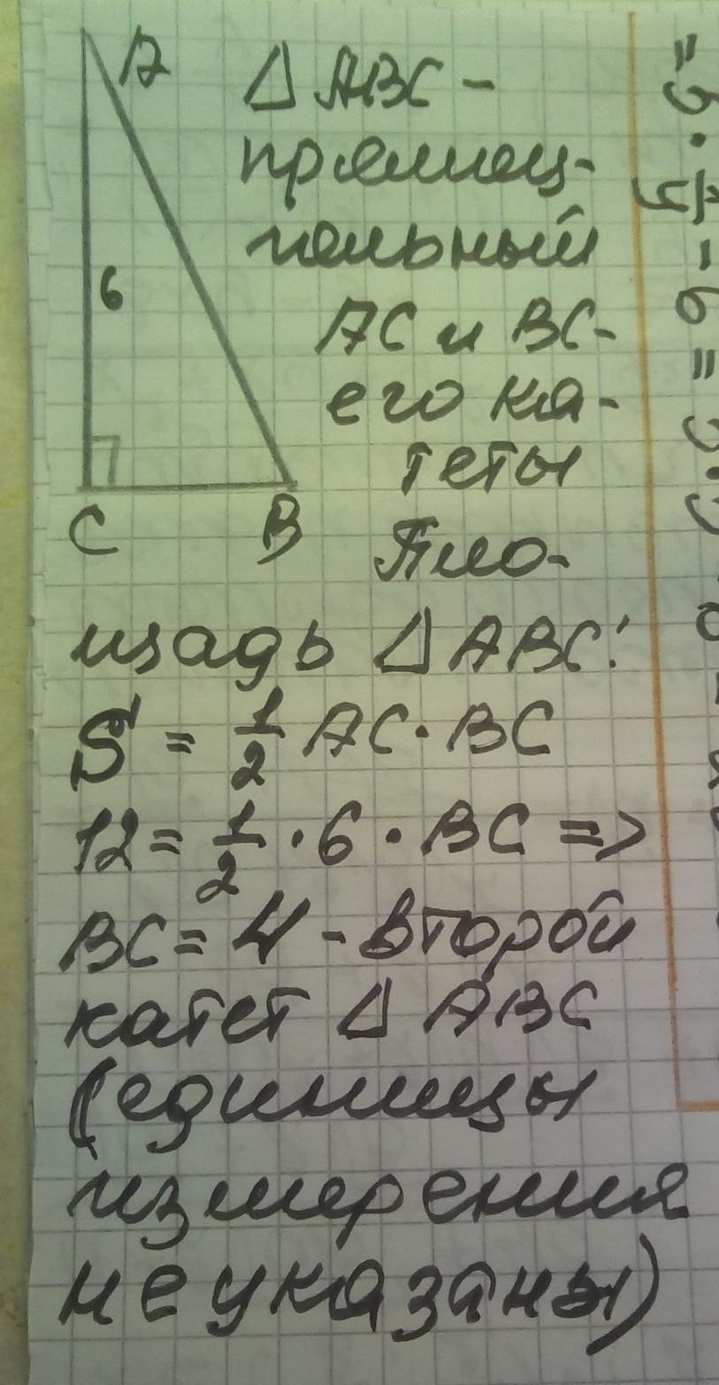 Площадь прямоугольного треугольника равна 12 а один из его катетов равен 6 найти другой катет (дайте полное решение