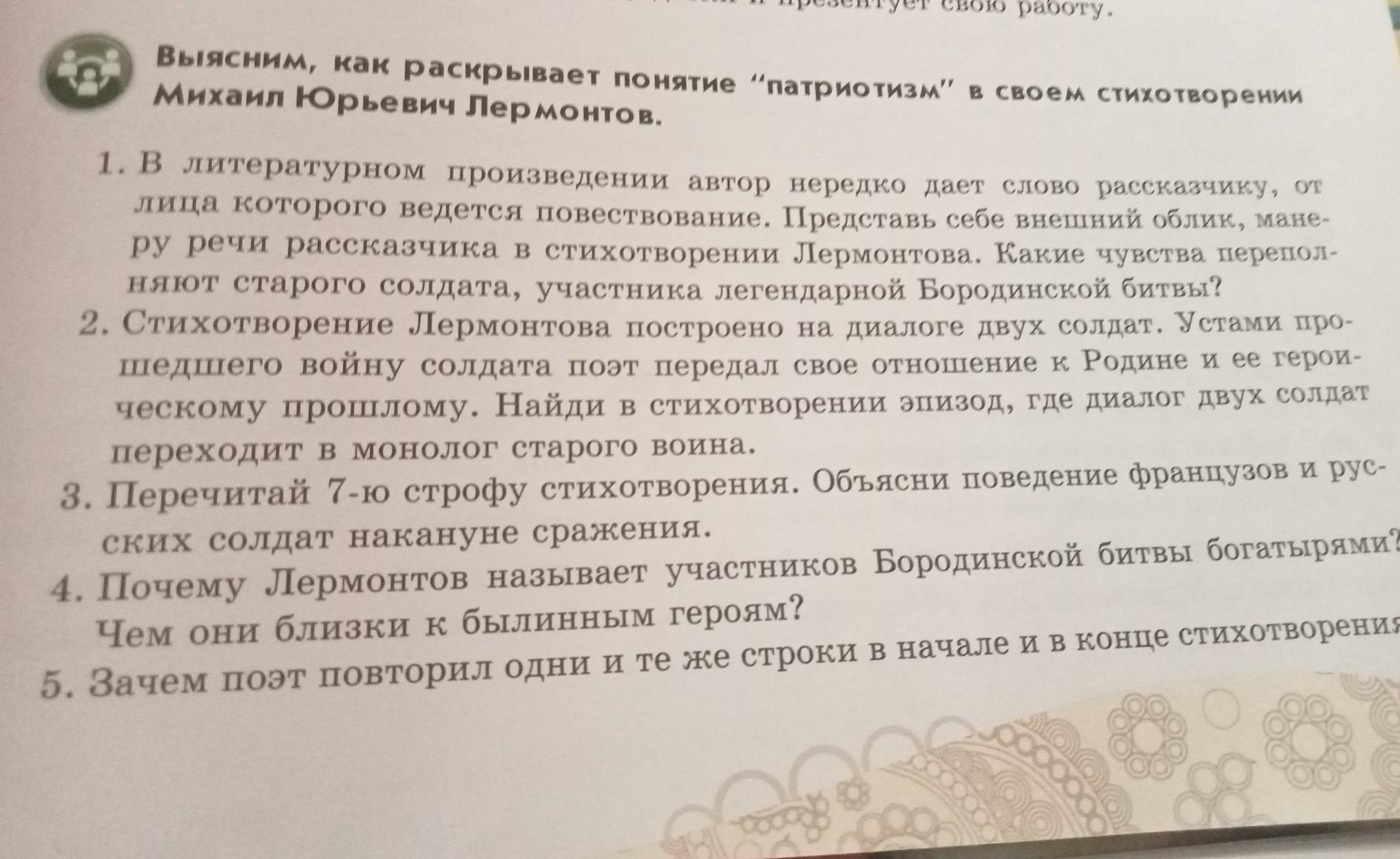 Выясним, как раскрывает понятие "патриотизм" в своем стихотворени Михаил Юрьевич Лермонтов. 1. В литературном произведении автор нередко дает слово рассказчику, от лица которого ведется повествование. Представь себе внешний облик, мане- ру речи рассказчика в стихотворении Лермонтова. Какие чувства перепол- няют старого солдата, участника легендарной Бородинской битвы? 2. Стихотворение Лермонтова построено на диалоге двух солдат. Устами про шедшего войну солдата поэт передал свое отношение к Родине и ее герои- ческому прошлому. Найди в стихотворении эпизод, где диалог двух солдат переходит в монолог старого воина. 3. Перечитай 7-ю строфу стихотворения. Объясни поведение французов и рус- ских солдат накануне сражения. 4. Почему Лермонтов называет участников Бородинской битвы богатырями Чем они близки к былинным героям? 5. Зачем поэт повторил одни и те же строки в начале и в конце стихотворения