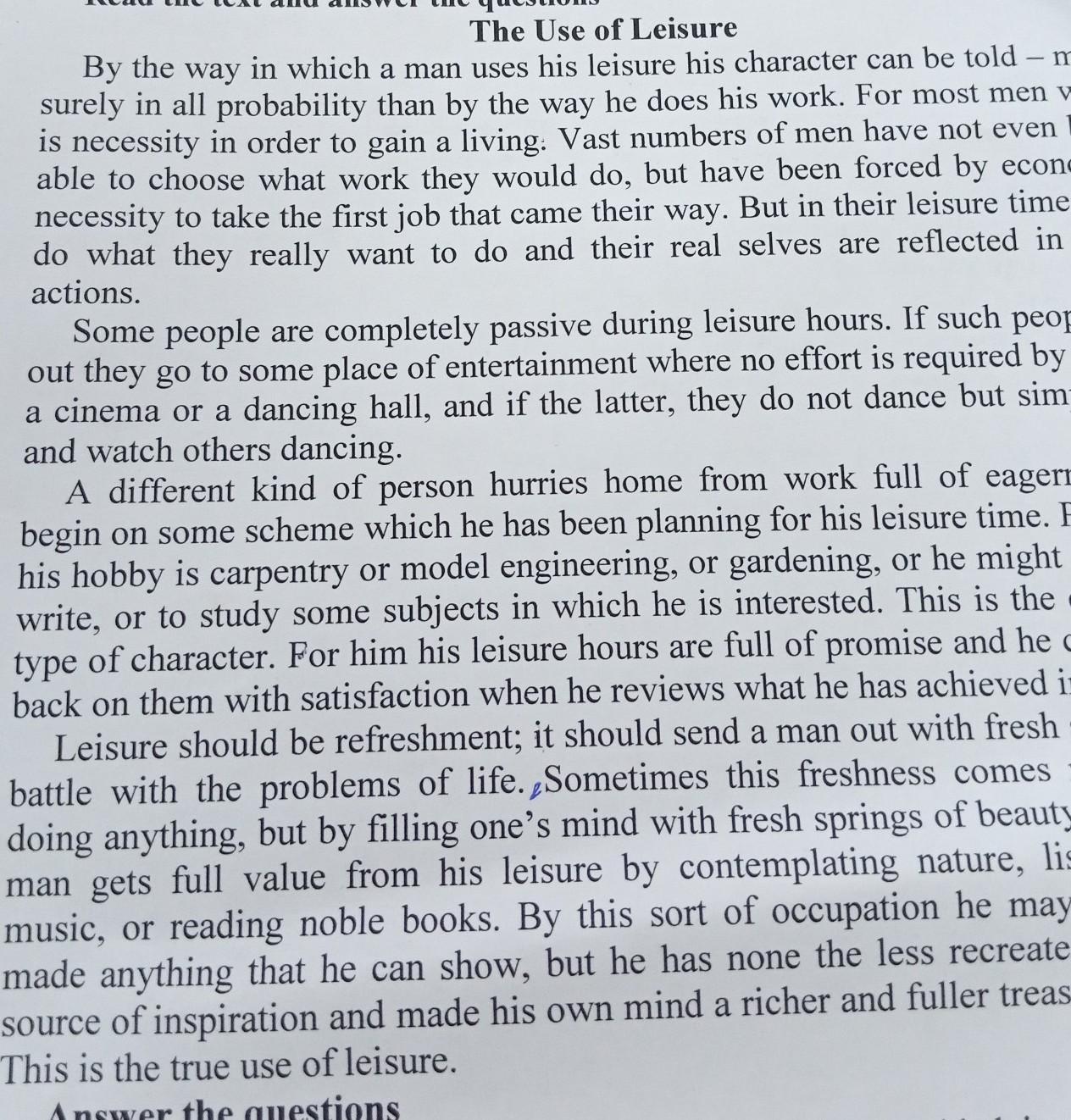 Answer the questions 1. Why can a man's character be told by the way he uses his leisure? 2. What do passive people do during leisure hours? 3 How does a creative type of character spend his leisure time? 4. Why should leisure be refreshment?