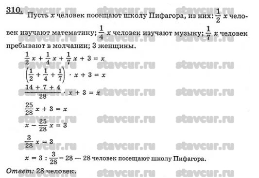 У древнегреческого математика Пифагора спросили:"Сколько у Вас учеников?" Он ответил: "Половина моих учеников изучает математику, четверть- природоведение, 1/7 проводят время в раздумьях, а 3 оставшихся являются девочками". Сколько учеников было у Пифагора?