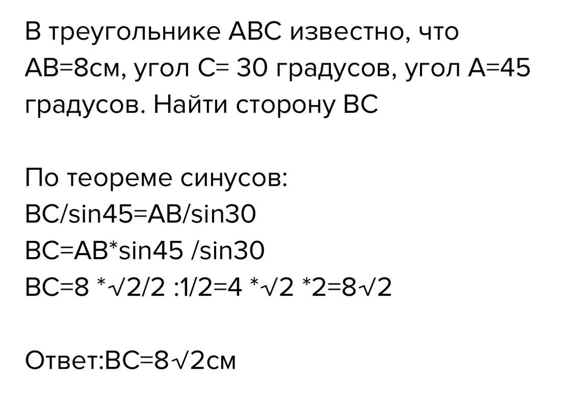 Пожалуйста 3. У трикутнику ABC AC = 8sqrt(3) angle B = 60 deg . angle C = 45 ^ t . Знайти сторону АВ і радіус кола, описаного навколо даного трикутника.