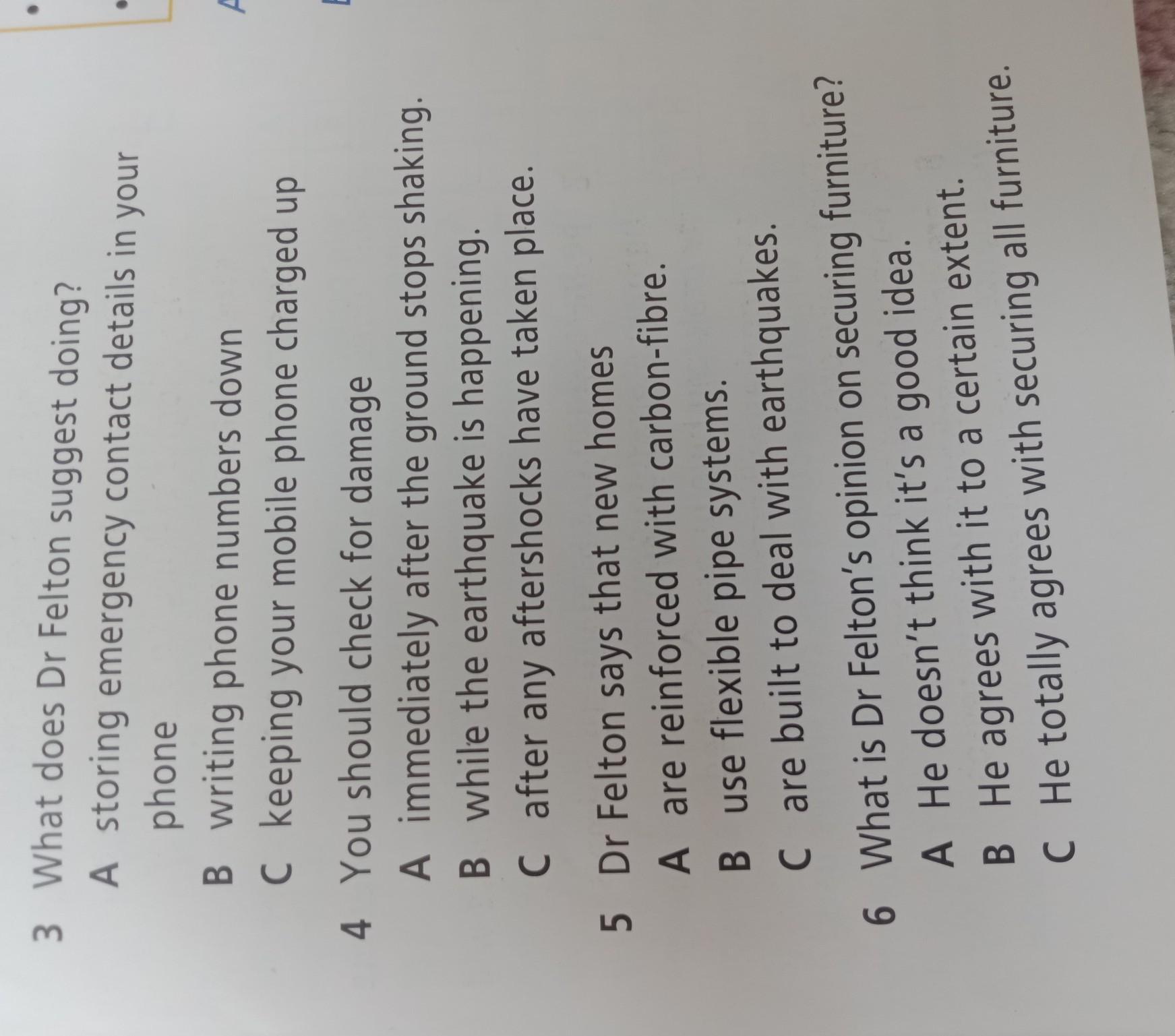 5 a) 10.2.7 You are going to listen to a seismologist talking to a group of students about earthquakes. Listen and choose the correct answer. 1 What does Dr Felton say about earthquake prediction?