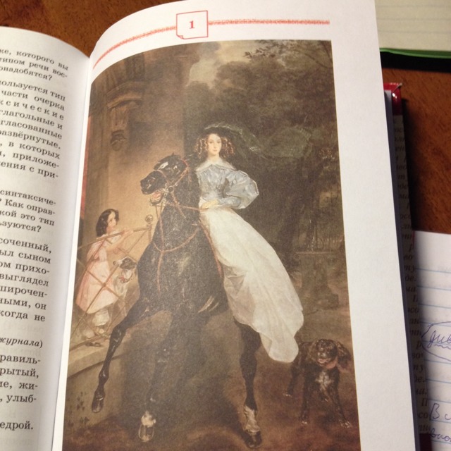 На переднем плане картины Брюллова "всадница" мы видим прекраную девушку сидящюю верхом на вороном коне. Конь поднялся на дыбы ,понимая комья грязи в воздух и пугая маленькую девочку на веранде ,но всадница сидит с непоколебимым лицом .Это говорит о том что Девушка уверена в себе и имеет сильный характер,о том что она ни капли не сомневается ,что сию минуту успокоит его.Причиной этому является собака ,которую мы видим на второстепенном положении.Очевидно что она залаяла от радости при встрече с маленькой девочкой,но конь испугался и хотел бежать,спасая себя.И действительно ,мы можем сказать что эта девушка истинная всадница,-хлоднокровная,уверенная в себя,и своем коне .Часто эти качества присущи только мужчинам ,но бывают и исключения.