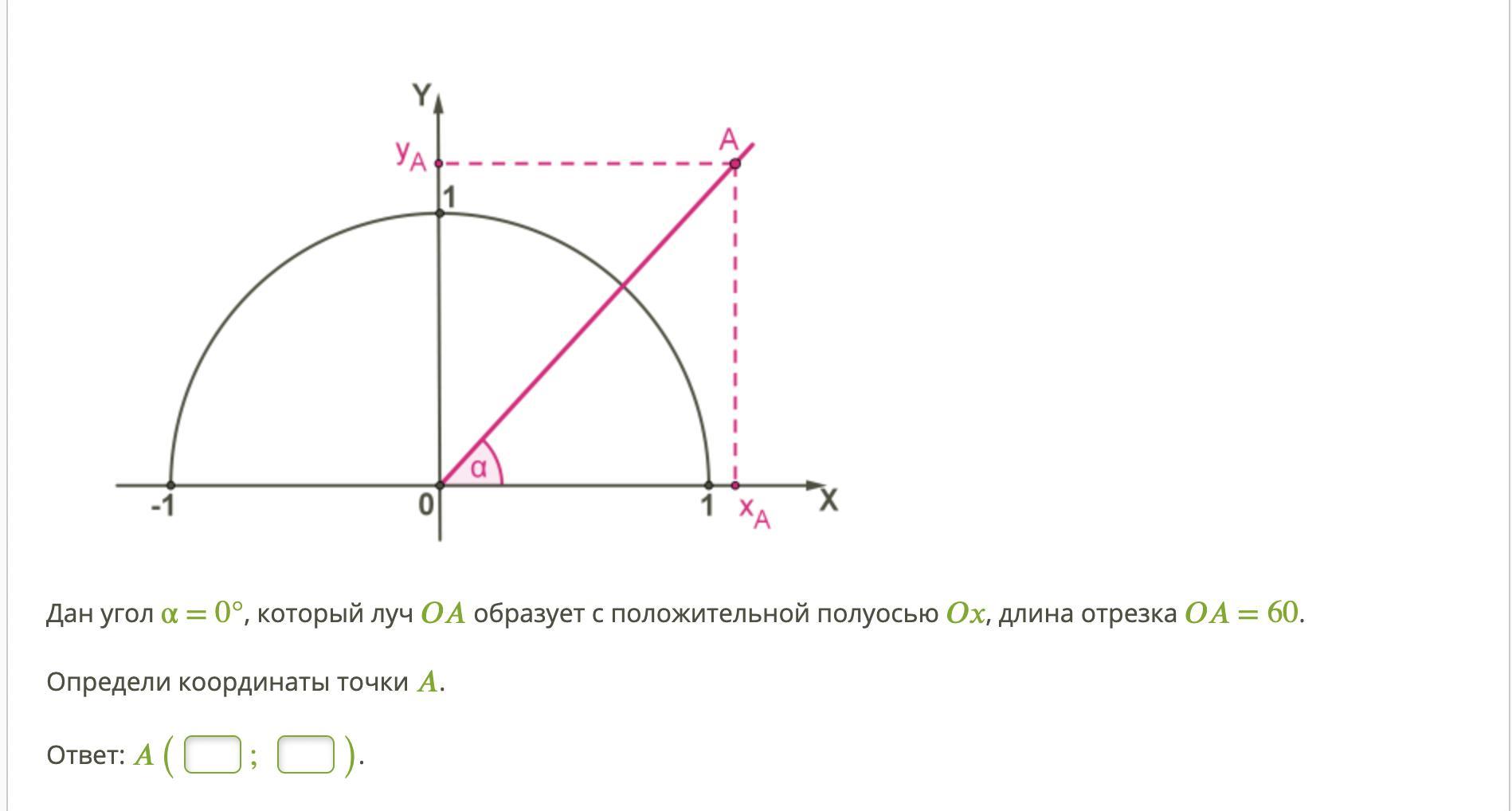 ∠α=0°, значит ОА совпадает с ОХ(А) и равен60, следовательно, точка А имеет