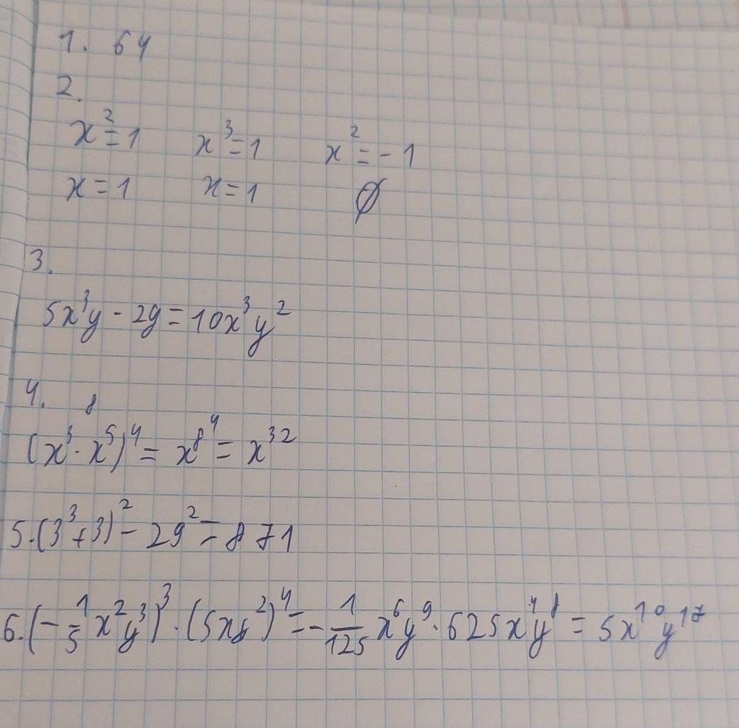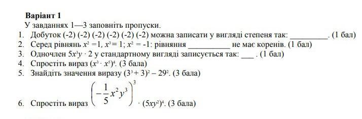 Варiант 1 У завданнях 1-3 заповніть пропуски. 1. Добуток (-2) (-2) (-2) (-2) (-2) (-2) можна записати у вигляді степеня так: 2. Серед рівнянь x²=1, x²=1; x²=-1: piBHHH 3. Одночлен 5х3y - 2 у стандартному вигляді записується так: . (1 бал) 4. Спростіть вираз (х3 - х). (3 бала) 5. Знайдіть значення виразу (33+ 3)2 - 29. (3 бала) 6. Спростіть вираз (2). 5 - (5ху²). (3 бала) не має коренів. (1 бал) (1 бал)