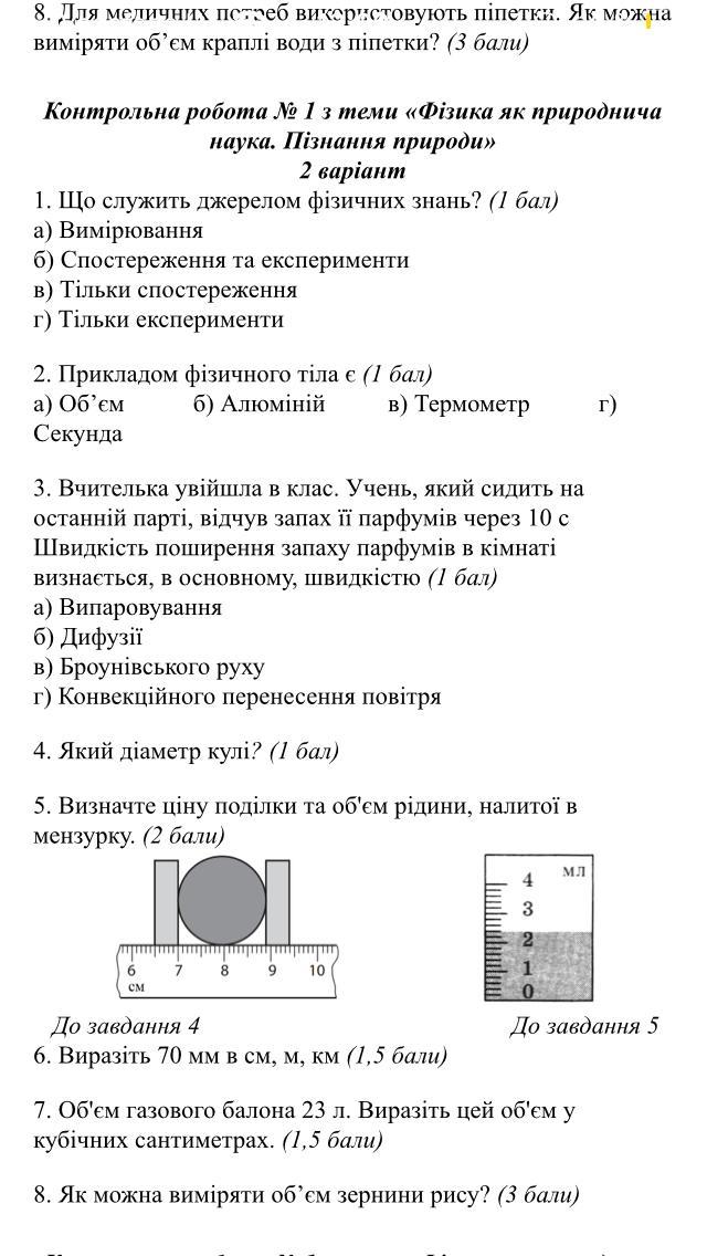 8. Виміряти об'єм рідини у посудині, потім погрузити туди рис, і виміряти