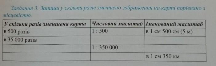 Завдання 3. Запиши у скільки разів зменшено зображення на карті порівняно з місцевістю. У скільки разів зменшена карта Числовий масштаб Іменований масштаб в 500 разів в 1 см 500 см (5 м) в 35 000 разів 1:500 1:350 000 в 1 см 350 км дуже сильно треба дам 10 балів