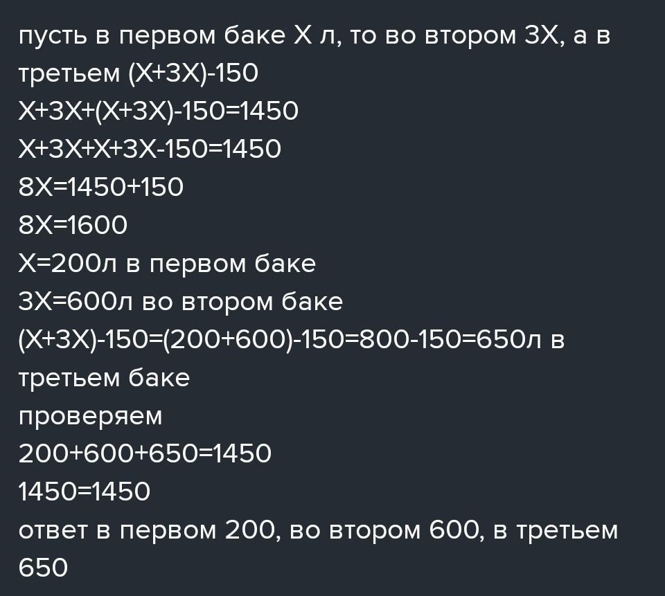 В три бака налито 1450 л воды. Во втором баке – в 3 раза больше воды, чем в первом, а в третьем – на 150 л воды меньше, чем в первом и во втором баках вместе. Сколько воды в каждом баке?