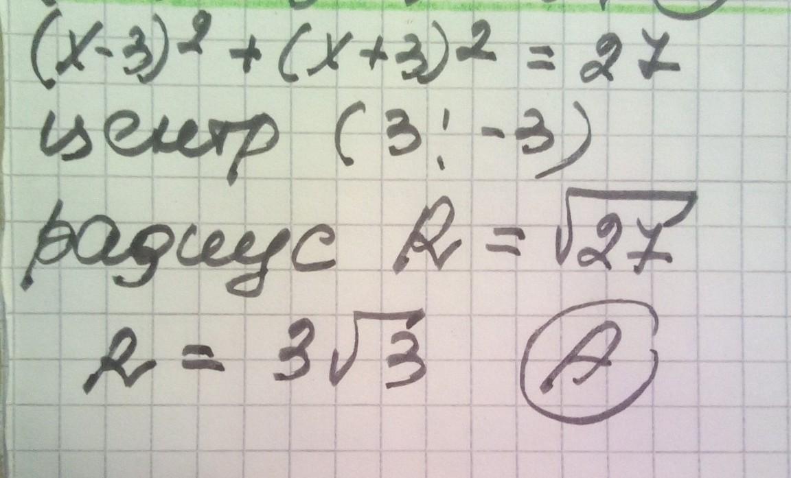 4. Найдите координаты центра и радиус окружности, заданной уравнением (x - 3)2 + (x + 3)2 = 27: A. O(3; -3), R =3/3; c. O(3; 3), R = 3/3; B. O(3;-3), R = 27; D. O(-3; 3), R=3/3.