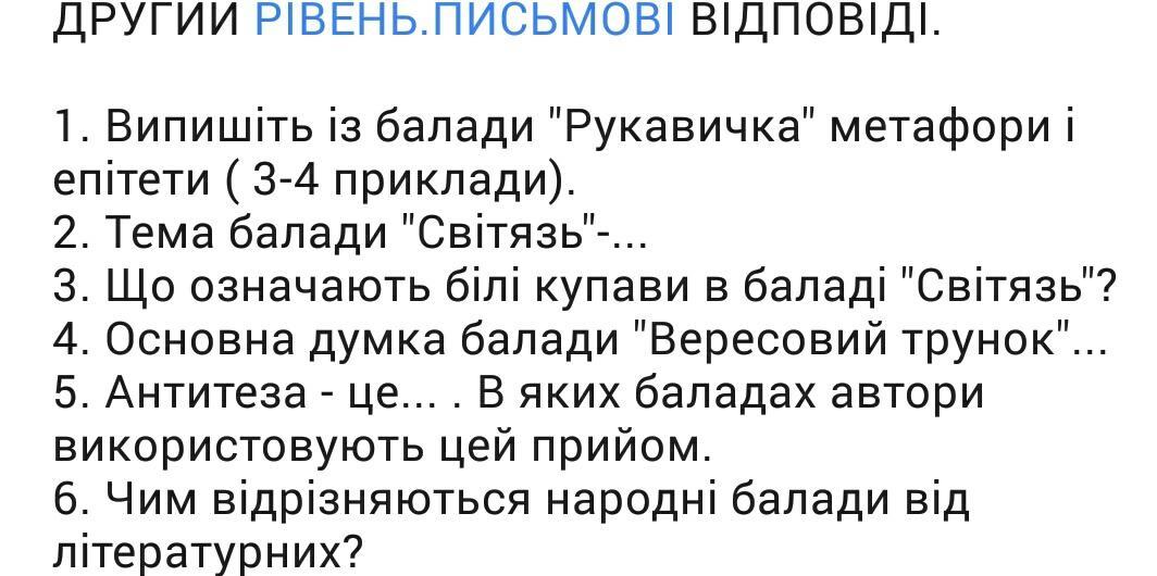 6) Фольклорна балада передавалася з вуст в уста ( не мала писемної форми), має кілька варіацій, а ще не має певного автора, бо склав її народ. А літературна балада має писемну форму, не має варіацій та має певного автора.