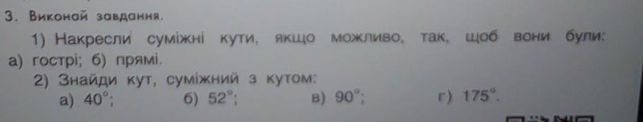 3. Викокой завдання 1) Накресли суміжні кути якщо можливо, так щоб вони булис а) гостра б) прям 2) Знайди кут, суміжний з кутом 6) 52%