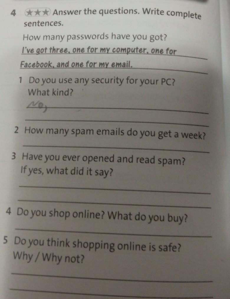 4 ★★★ Answer the questions. Write complete sentences. How many passwords have you got? I've got three, one for my computer, one for Facebook, and one for my email. 1 Do you use any security for your PC? What kind? 2 How many spam emails do you get a week? 3 Have you ever opened and read spam? If yes, what did it say? 4 Do you shop online? What do you buy? 5 Do you think shopping online is safe? Why / Why not?