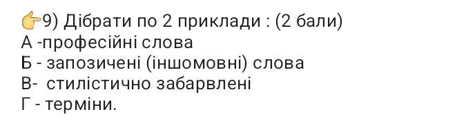 Запозичені( іншомовні слова): футбол, спорт, опера, фонтан( обери які подобаються)