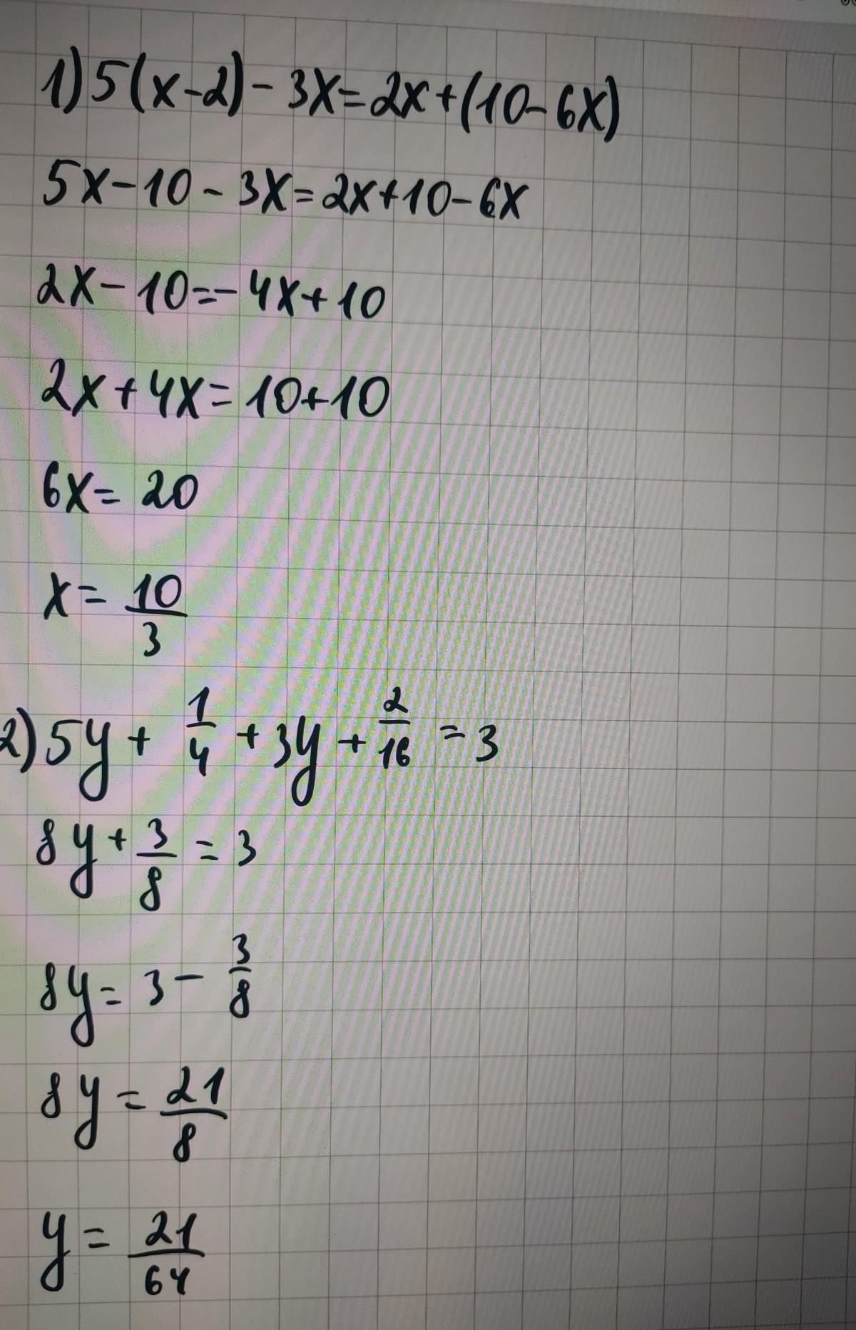 Розв'яжіть рівняння: 1) 5(x-2) - 3 x = 2x + (10-6x); 2) 5y+1/4 + 3y+2/16 = 3;