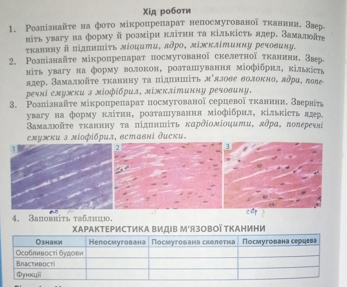-будова: . Це тканина, яка складається з клітин-кардіоміоцитів й утворює серцевий м'яз - міокард. Клітини з'єднуються кінцями в багатоядерні м'язові волокна. Між волокнами наявні вставні диски, завдяки чому збудження швидко поширюються по всьому серцевому м'язу.