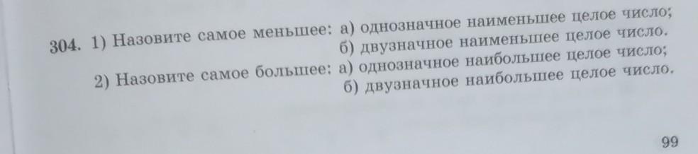 304. 1) Назовите самое меньшее: 2) Назовите самое большее: а) однозначное наименьшее целое число б) двузначное наименьшее целое число. а) однозначное наибольшее целое число; б) двузначное наибольшее целое число.