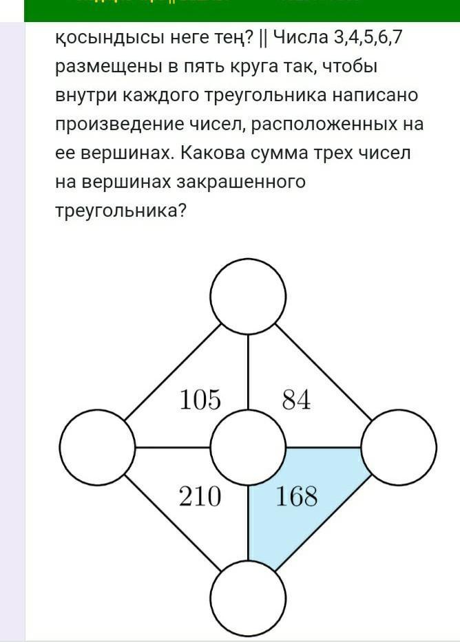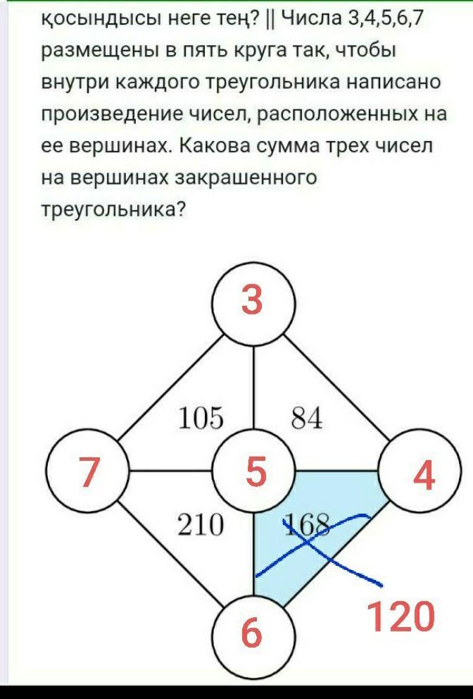 105=3*5*7; 84=2*2*3*7; 168=2*84=2*2*2*3*7; 210=2*105=2*3*5*7; В центре 7; Слева 5; Вверху 3: Внизу 6; Справа 4; 7+4+6=17;