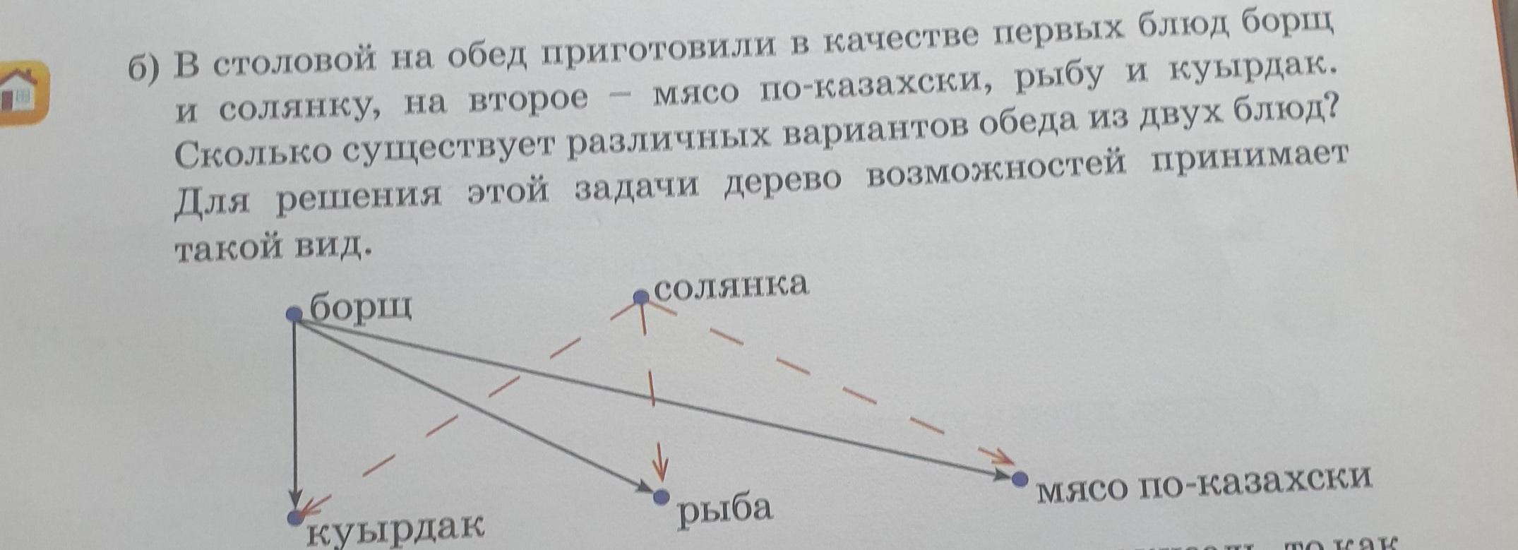 Первое блюдо можно выбрать двумя способами, второе блюдо — тремя. Значит, по комбинаторному правилу умножения обед можно выбрать способами.