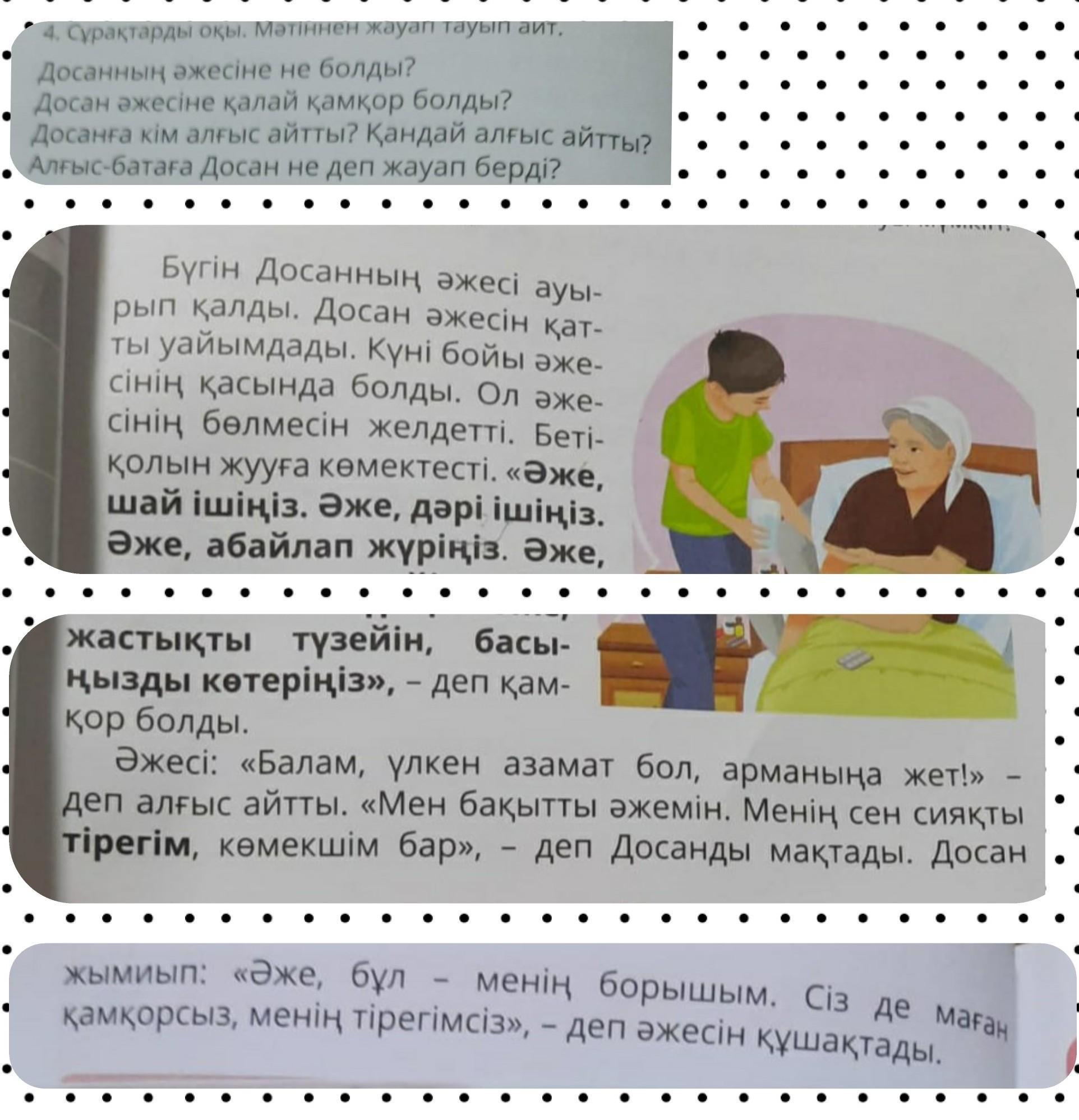 2 күні бойы әжесінің қасында болды, әжесінің бөлмесің желдетті,бетті қолын жууға көмекті