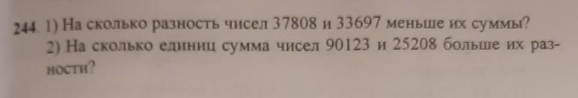 244. 1) На сколько разность чисел 37808 и 33697 меньше их суммы? 2) На сколько единиц сумма чисел 90123 и 25208 больше их раз- ности?