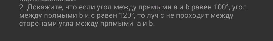 2. Докажите, что если угол между прямыми а и ь равен 100º, угол между прямыми b и с равен 120°, то луч с не проходит между сторонами угла между прямыми а и b.