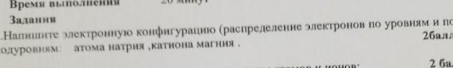 Напишите электронную конфигурацию(распределение электронов по уровням и подуровням атом натрия,катиона магния)