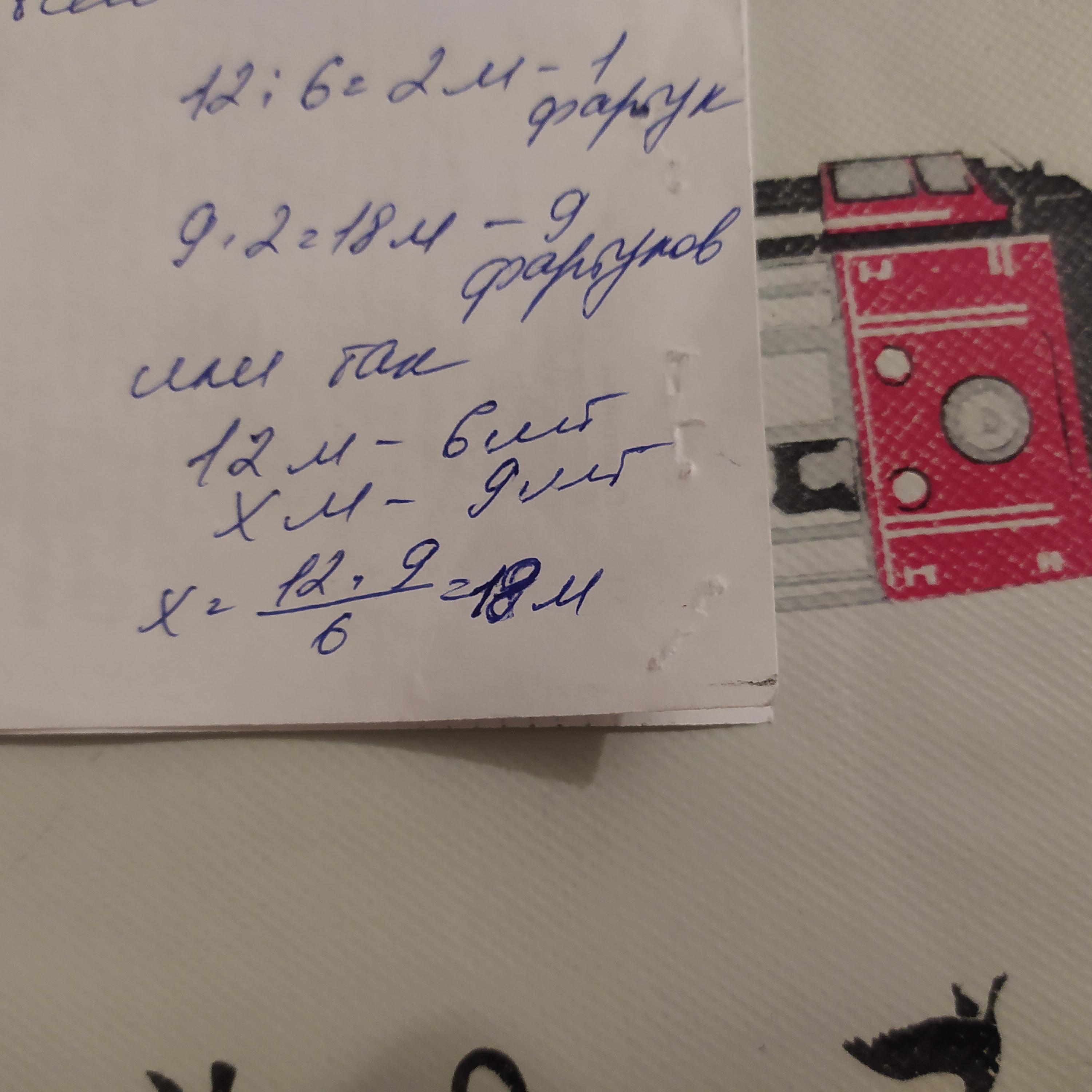 Швачка з 12 м тканини пошила 6 одн- акових фартухів. Скільки треба метрів тканини. щоб пошити ще 9 таких фартухів?