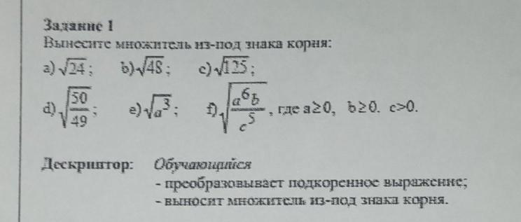 задание 1 вынесите множитель из под корня:√24;√48;√125,можете ответить с решением, пожалуйста. ДАЮ 25 баллов