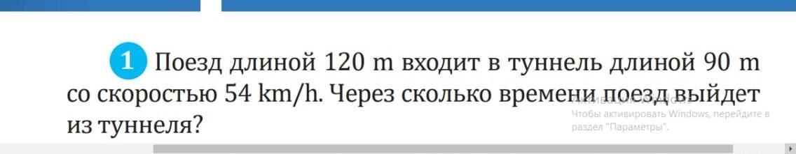 1 Поезд длиной 120 m входит в туннель длиной 90 m со скоростью 54 km/h. Через сколько времени поезд выйдет из туннеля? срочно пожалуйста