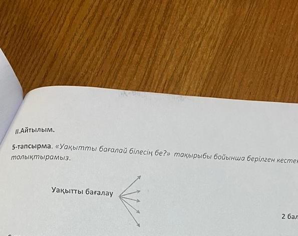 5-тапсырма. «Уақытты бағалай білесің бе?» тақырыбы бойынша берілген кестені молыктырамыз. Уақытты бағалау 2 балл