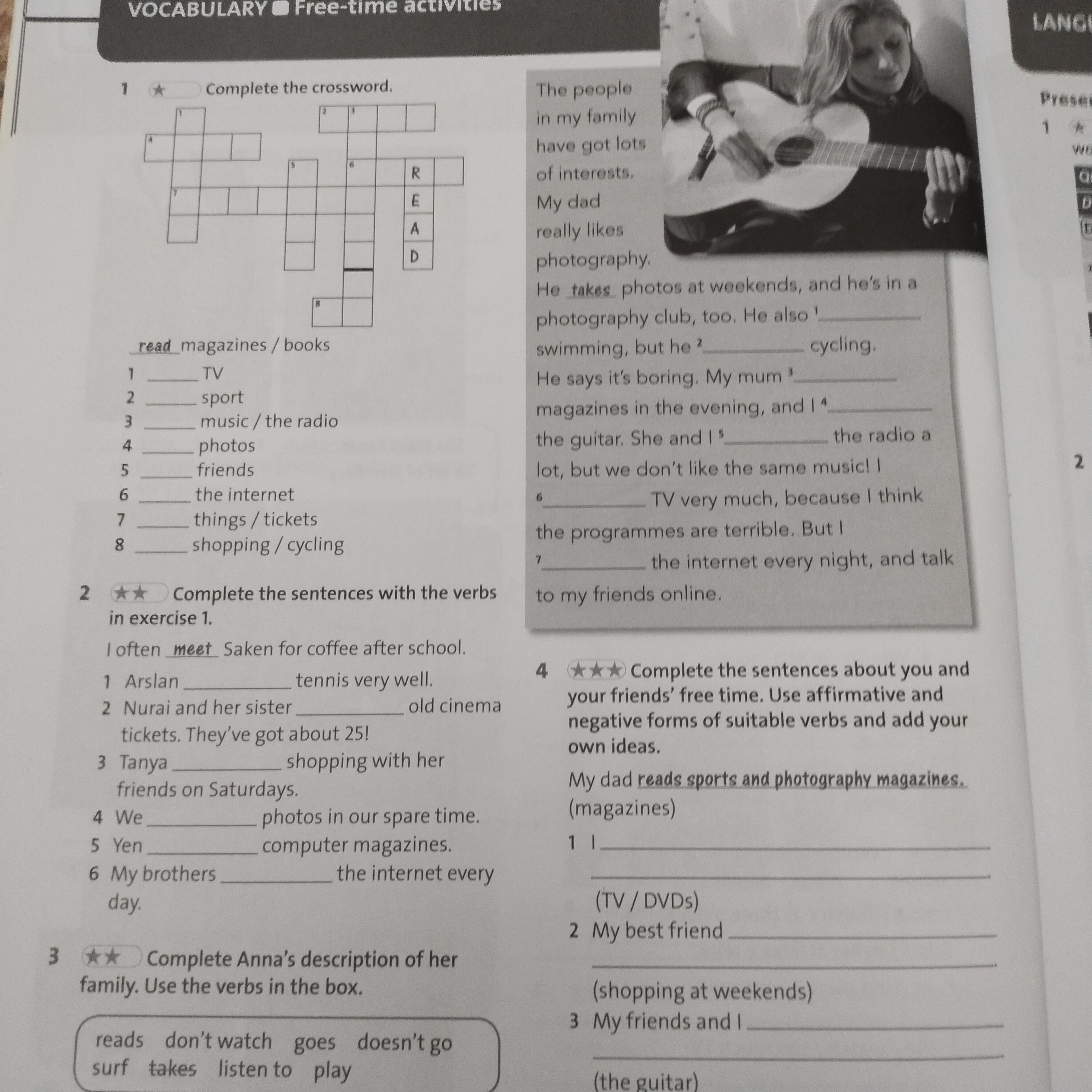 1. watch 2. play 3. listen 4. take 5. meet 6. surf 7. collect 8. go
