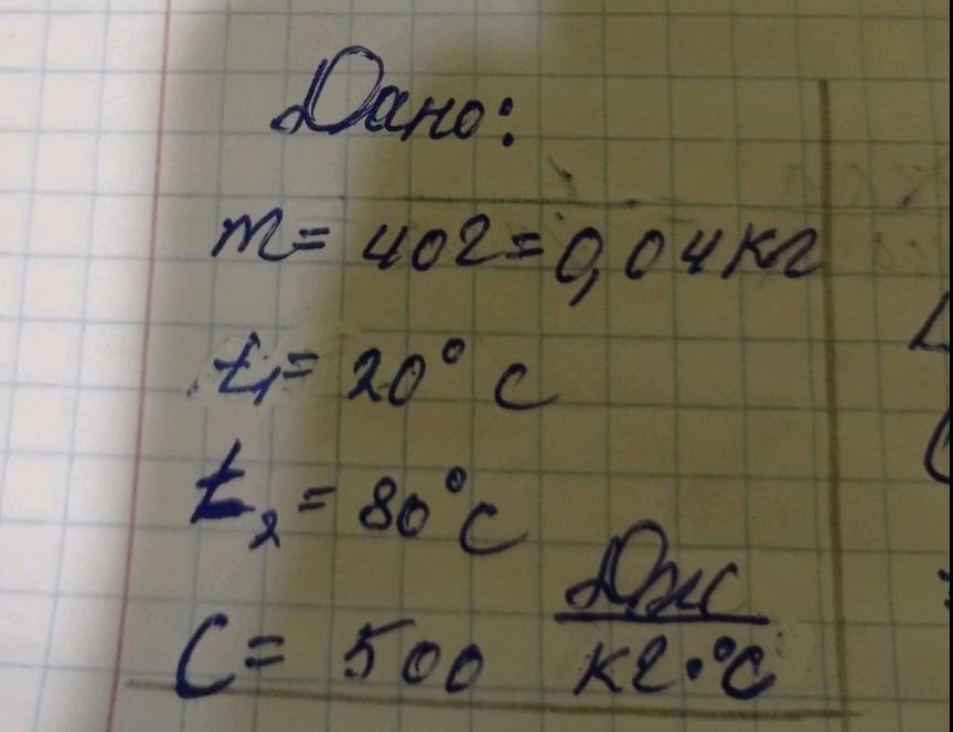 Q=cm(t2-t1)=500*0,04*(80-20)=1200Дж=1,2кДж