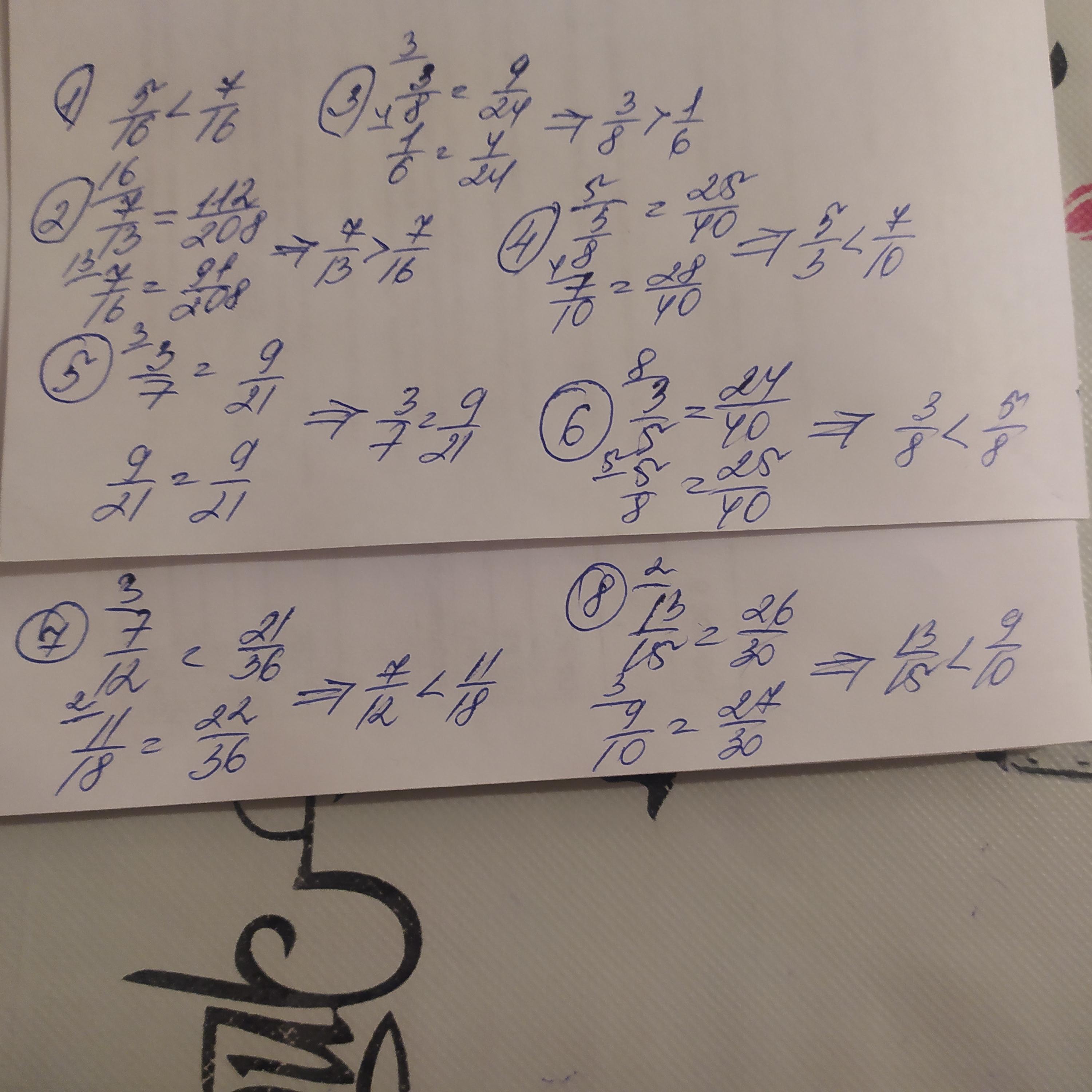 порівняйте дроби: 1) 5/16 і 7/16, 2) 7/13 і 7/16, 3) 3/8 і 1/6, 4) 5/8 і 7/10, 5) 3/7 і 9/21, 6) 3/5 і 5/8, 7) 7/12 11/18, 8) 13/15 і 9/10