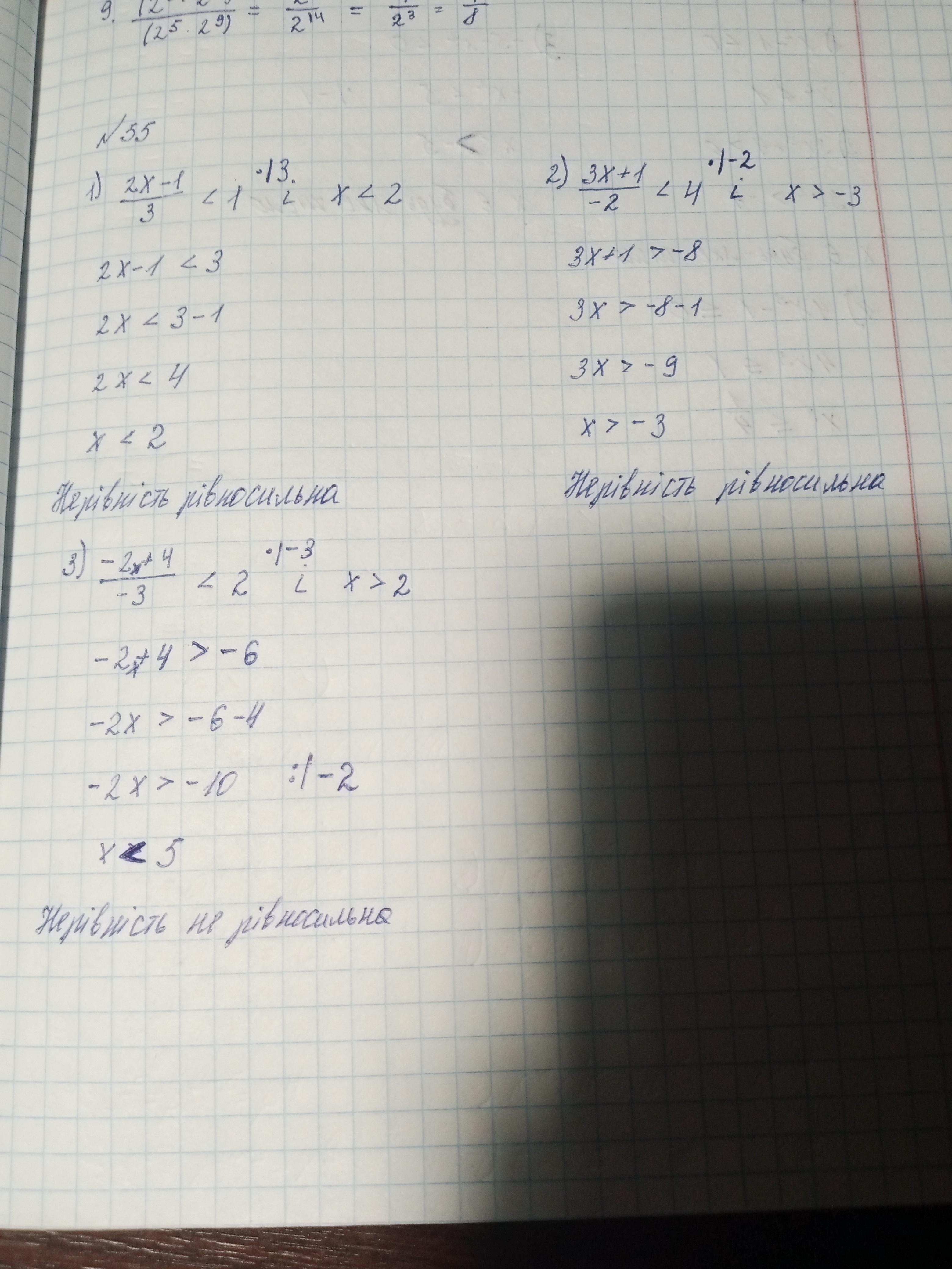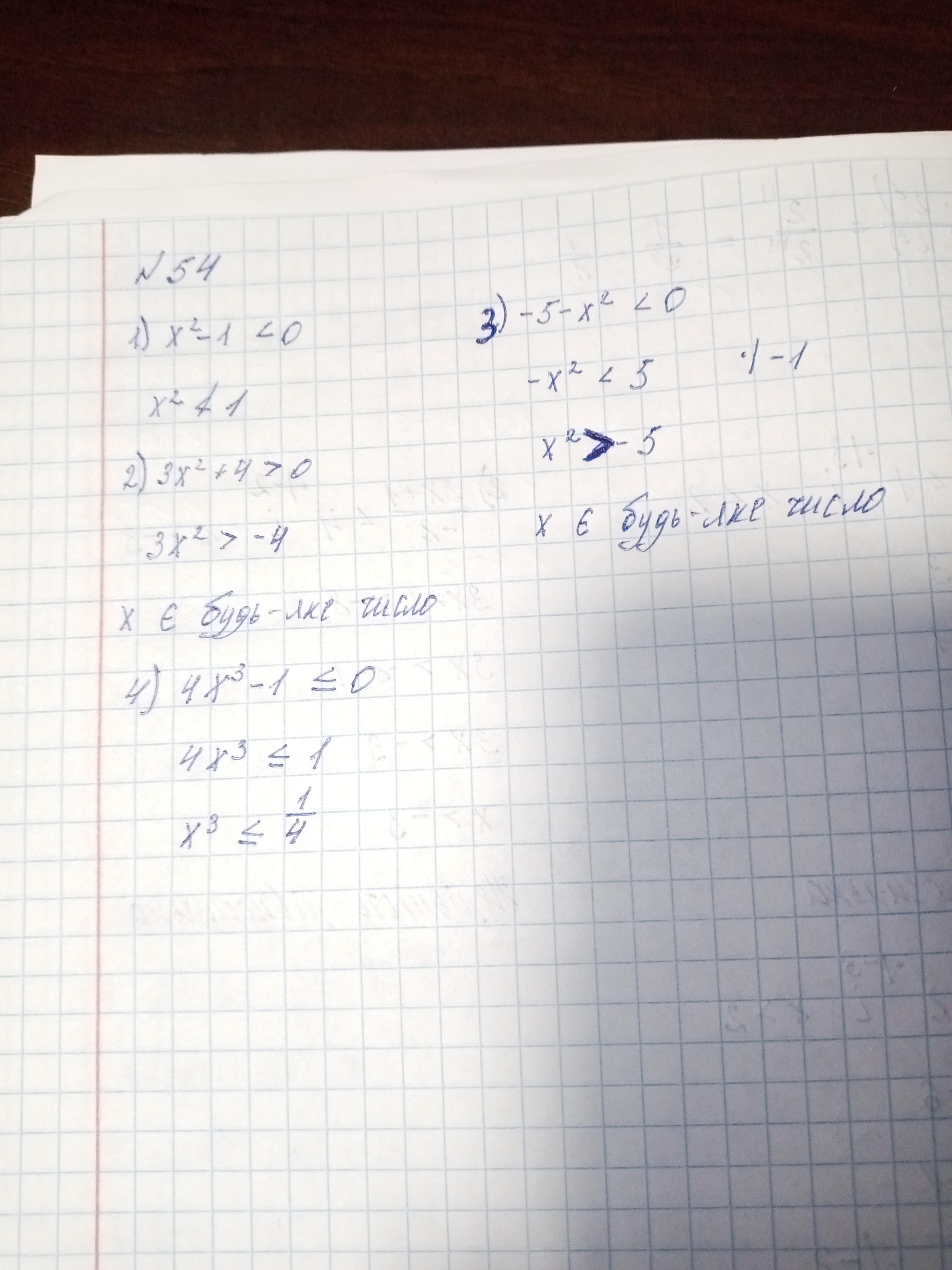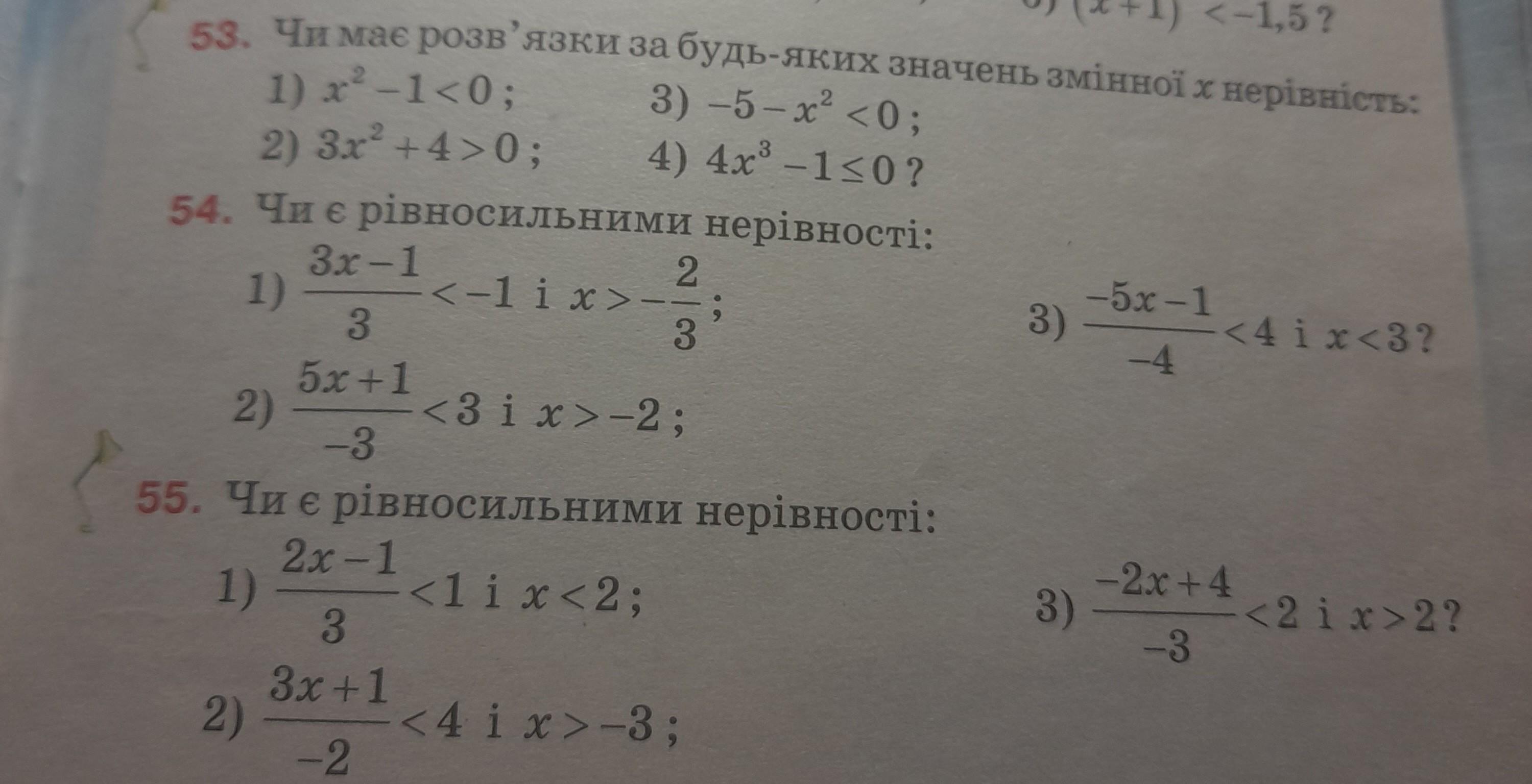 Ответ: в 53 я не уверена там 1 ) неправильная нерівність х^2 завжди буде більше 1, а у нас знак менше, 2) х є будь-яке число, 3) х є будь яким числом, 4) х^3 буде строго більше 1/4, а у нас меньше або дорівнює тому нерівність неправильна. В 55 1) Так, 2) Так, 3) Ні