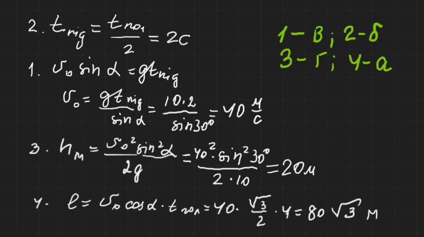 тіло, яке кинули під кутом 30⁰ до горизонту, було в польоті 4с. Установіть відповідність між фізичною величиною та її числовим значенням: