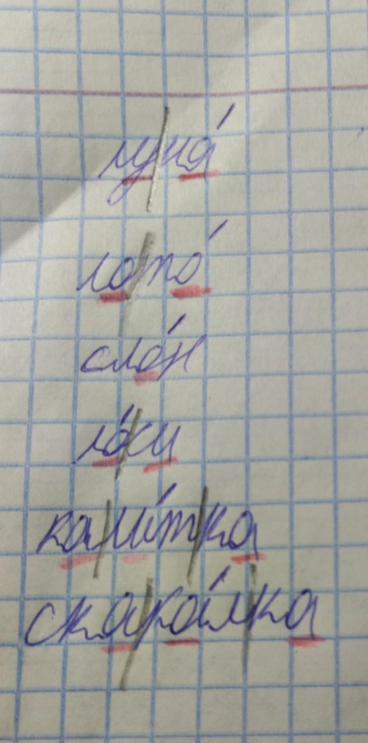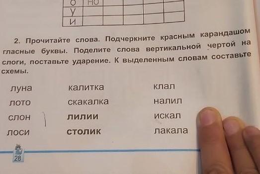2. Прочитайте слова. Подчеркните красным карандашом гласные буквы. Поделите слова вертикальной чертой на слоги, поставьте ударение. К выделенным словам составьте схемы. луна лото СЛОН лоси калитка скакалка лилии СТОЛИК клал налил искал лакала