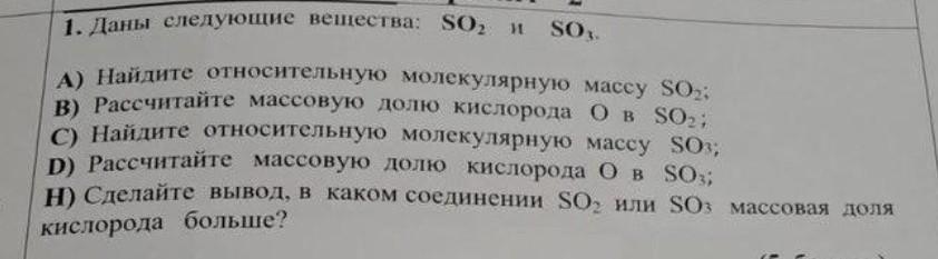 1. Даны следующие вещества: S*O_{2} и S*O_{1} А) Найдите относительную молекулярную массу S*O_{2} . D) Рассчитайте массовую долю кислорода О в S O 1; H) Сделайте вывод, в каком соединении S*O_{2} или SO : массовая доля кислорода больше? C) Найдите относительную молекулярную массу S O 3; B) Paceчитайте массовую долю кислорода О в S*O_{2}