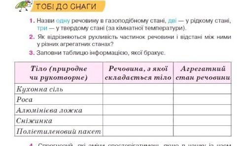 ТОБІ ДО СНАГИ 1. Назви одну речовину в газоподібному стані, дві - у рідкому стані, три - у твердому стані (за кімнатної температури). 2. Як вiдрiзняються рухливiсть частинок речовини і відстані між ними у рiзних агрегатних станах? 3. Заповни таблицю інформацією, якоï бракує. Тіло (природне чи рукотворне) Кухонна сiль Poca Алюмінієва ложка Сніжинка Поліетиленовий пакет срочно очень