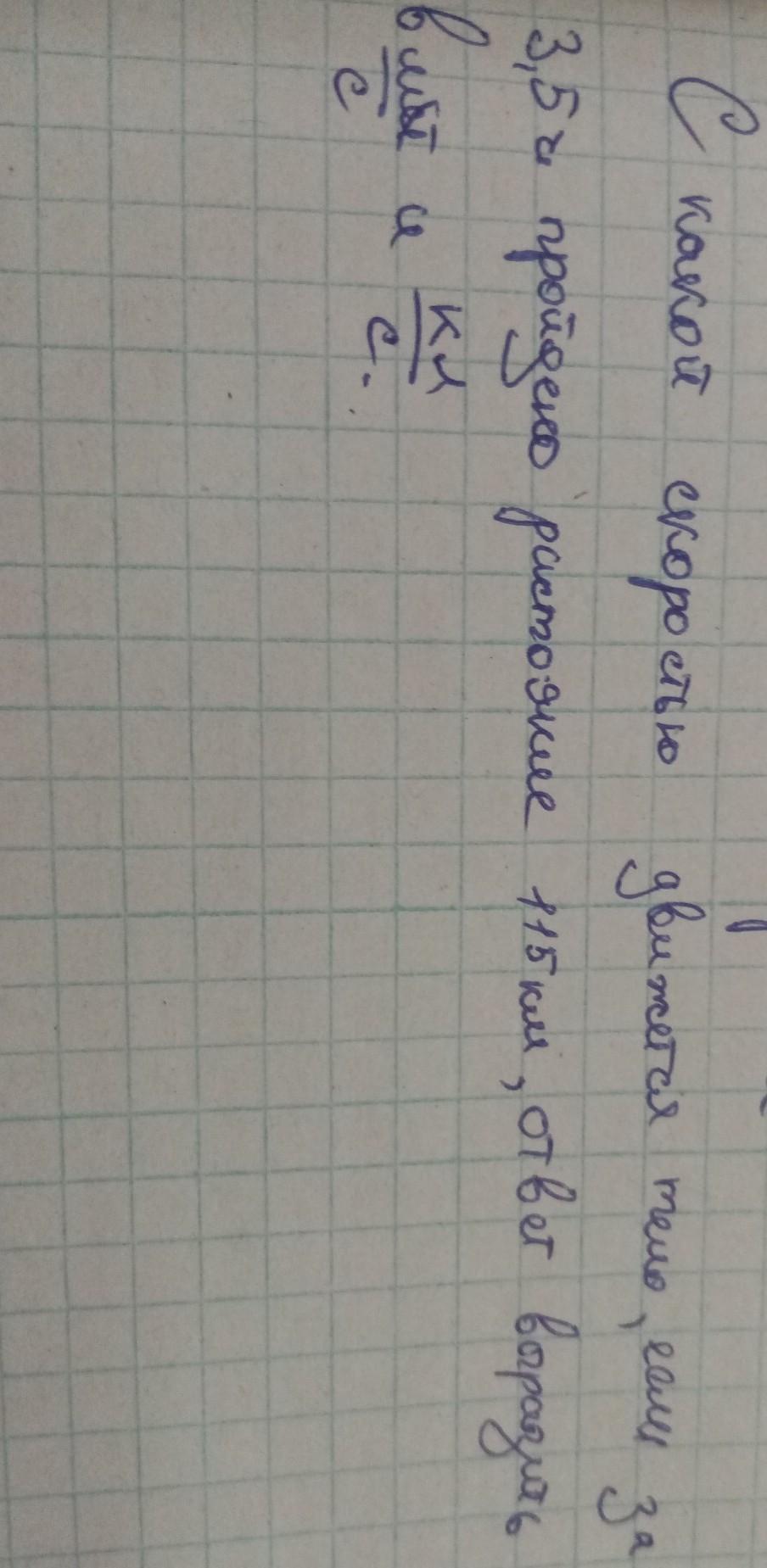 С какой скоростью движется тело, если за 3,5 ч пройдено растояние 115км,ответ выразить в м/с и кл/с пожалуйста даю 30 баллов