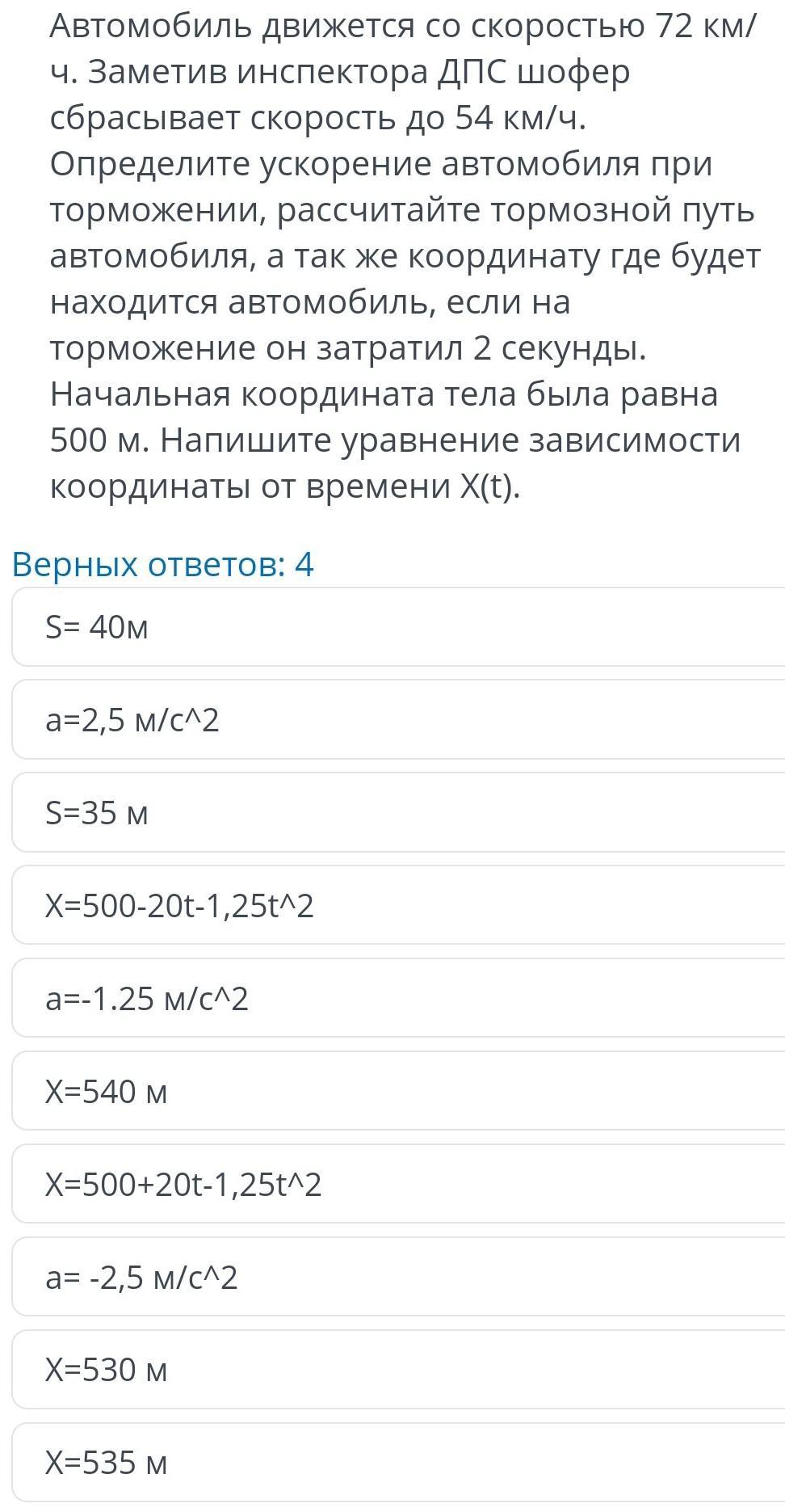 Автомобиль движется со скоростью 72 км/ ч. Заметив инспектора ДПС шофер сбрасывает скорость до 54 км/ч. Определите ускорение автомобиля при торможении, рассчитайте тормозной путь автомобиля, а так же координату где будет находится автомобиль, если на торможение он затратил 2 секунды. Начальная координата тела была равна 500 м. Напишите уравнение зависимости координаты от времени x(t). Верных ответов: 4 S= 40м a=2,5 м/с^2 S=35 М X=500-20t-1,25t^2 a=-1.25 м/с^2 Х=540 м х=500+20t-1,25t^2 a= -2,5 м/c^2 Х=530 м Х=535 м