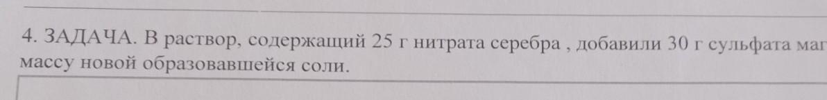 4. Задача. В раствор, содержащий 25 г нитрата серебра, добавили 30г сульфата магния. Определите массу новой образовавшейся соли.